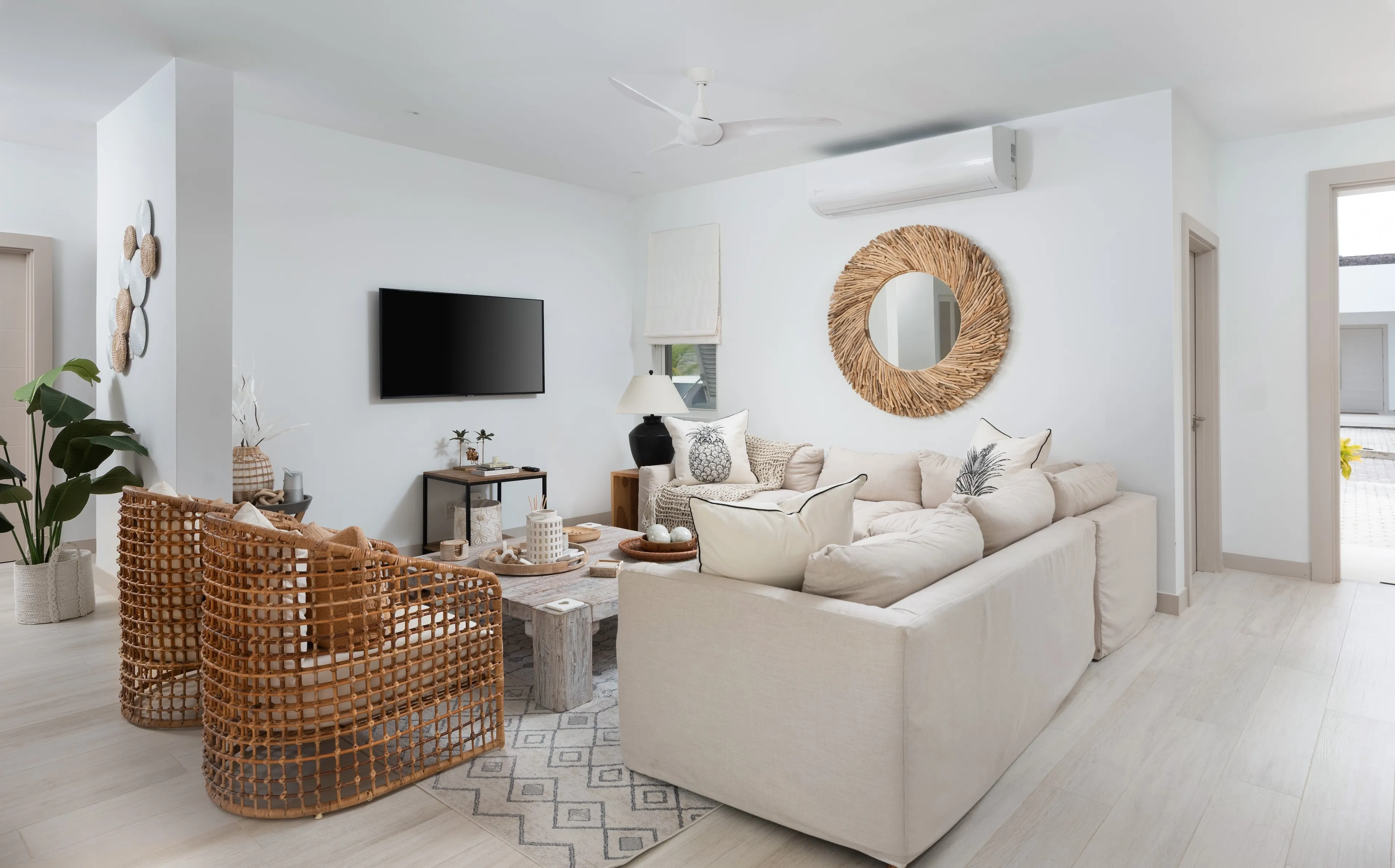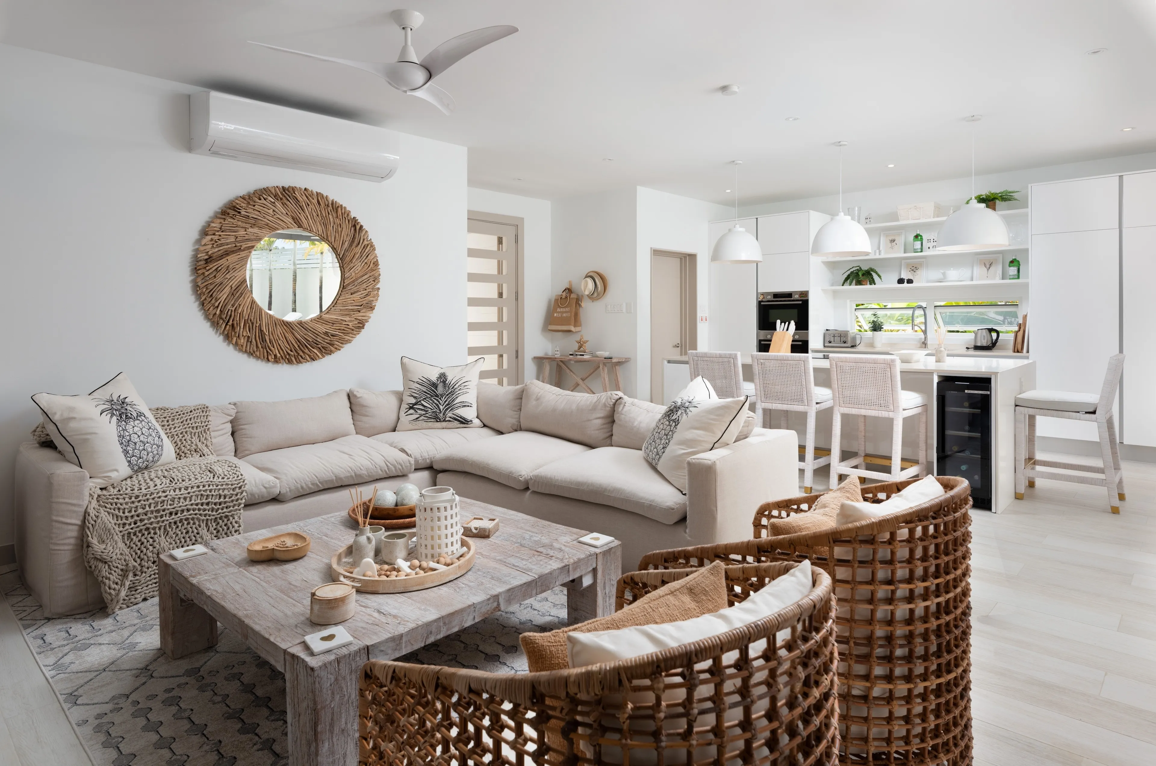 Inside, a stylish, modern kitchen with a central island and high-end finishes opens to a bright and breezy living area. Air conditioning runs throughout, and soft neutral tones, natural textures, and curated artwork create a relaxed, coastal feel.
